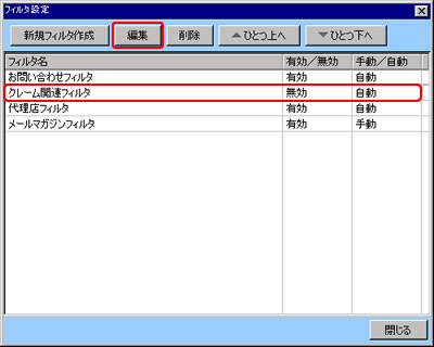 フィルタ一覧画面で「編集」を押すと設定内容が編集できます。