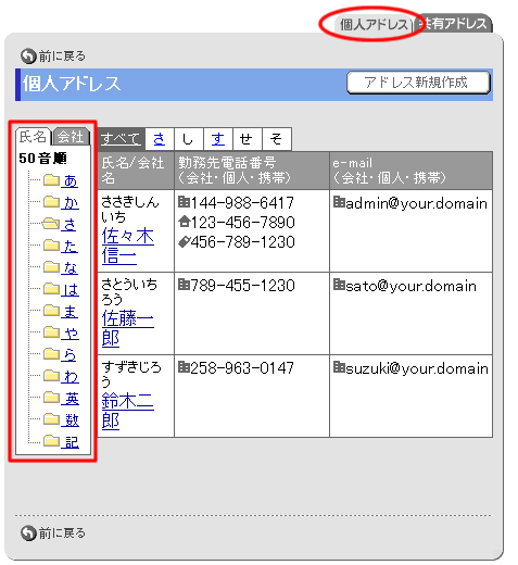 自分だけで編集・閲覧できる(他のユーザーは見られない)アドレス帳です。 「あ〜わ」「英語」「数字」「記号」のリンクを押してアドレス一覧を切り替えることができます。 ※50音順はアドレス登録・変更で設定した、氏名のふりがなと勤務先会社名のふりがなを対象としています。