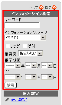 [キーワード]、[インフォメーショングループ]、[フラグ]、[添付]、[重要度]、[掲示期間]の検索条件があります。