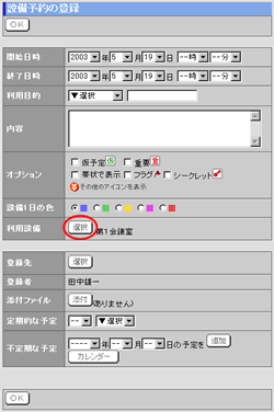設備予約の登録画面で、[利用設備]欄の を押します。