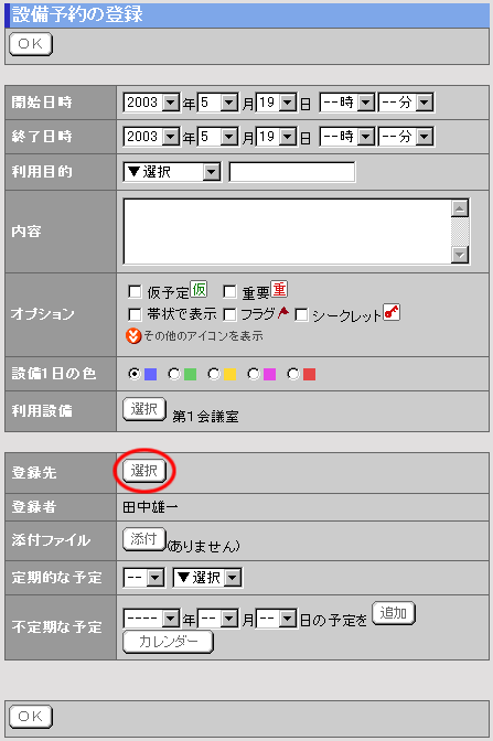 設備予約の登録画面で、[登録先]欄の を押します