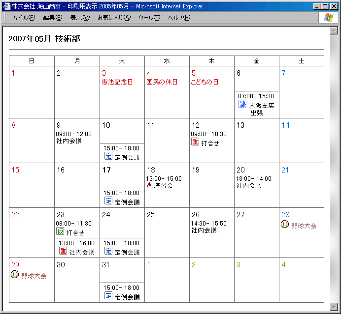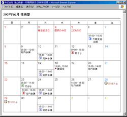 [グループ(週間/月間/カレンダ形式)]の”カレンダ形式”リンクを押すと、グループの月間スケジュールがカレンダーの形で印刷用に表示されます。