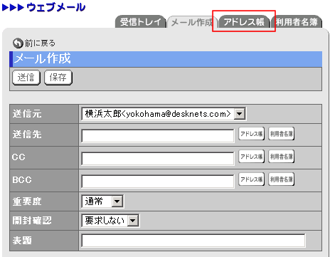 画面上部の「アドレス帳」タブ、または「送信先」、「CC」、「BCC」欄にある「アドレス帳」ボタンを押し、アドレス帳一覧を表示します。