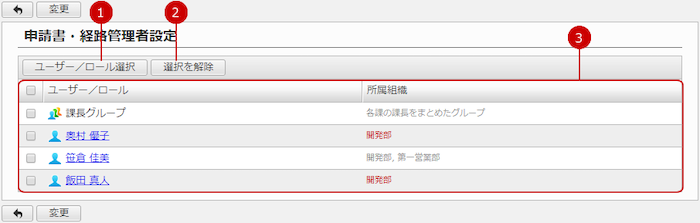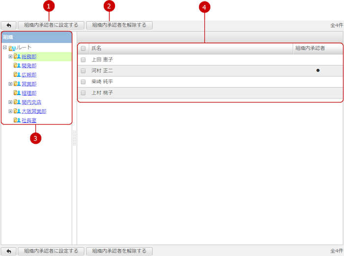 一覧から組織内承認者に設定したいユーザーを選択し、このボタンで実行します。複数のユーザーを同時に選択することもできます。