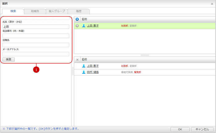 検索、組織別、個人グループ、履歴などからユーザーや組織を検索してユーザーや組織を選択することができます。